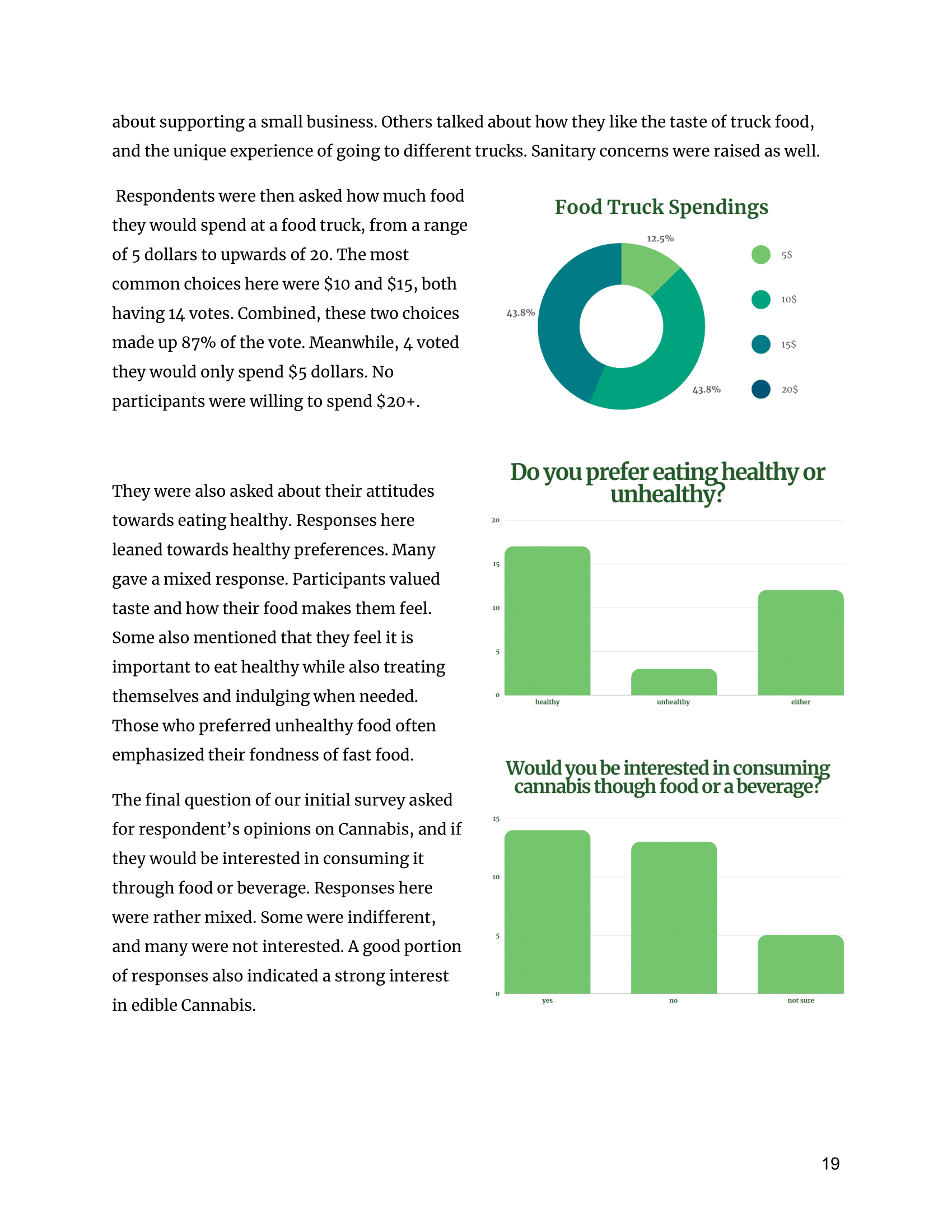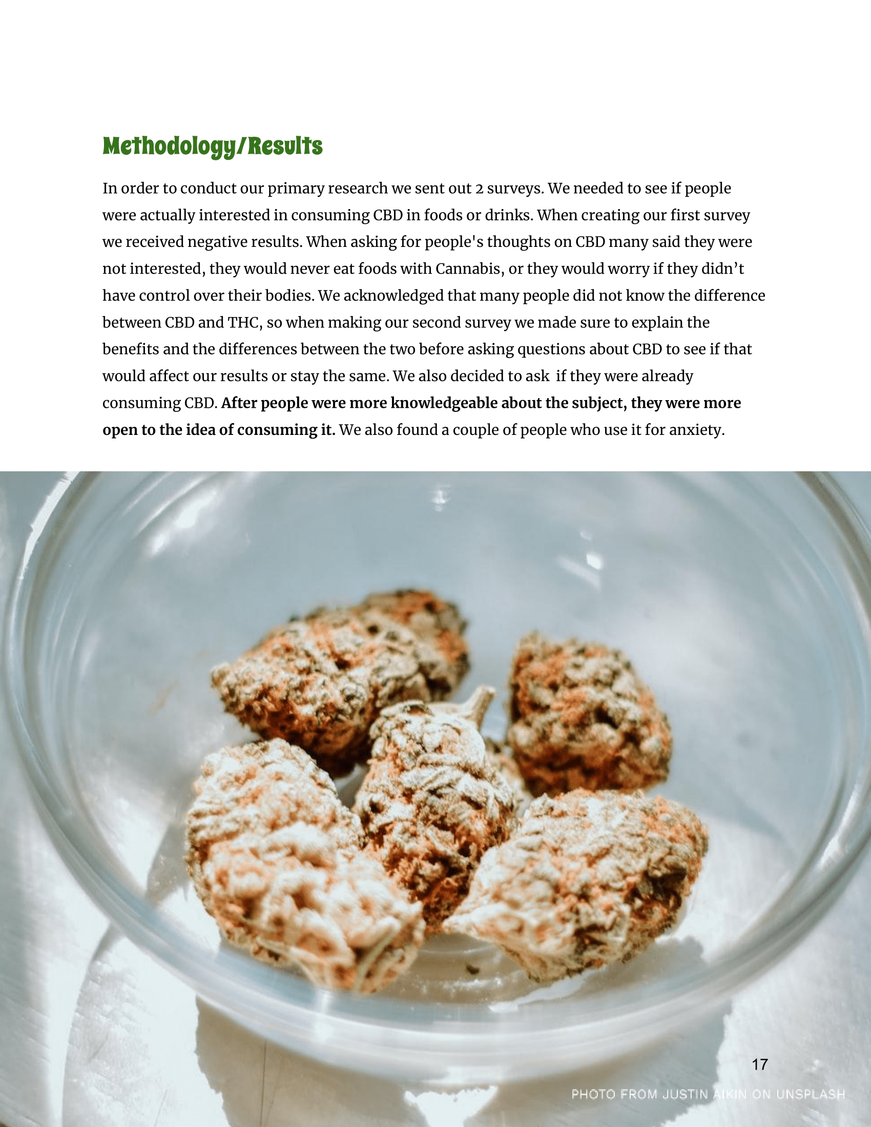 We conducted both primary and secondary research to identify the top food trends of 2023, and our findings pointed to CBD-infused foods and drinks as the leading trend. To further inform our strategy, we explored the history of cannabis, examining its benefits, potential concerns, and evolving legal landscape. This research not only deepened our understanding of the market but also helped us assess the opportunities and challenges of incorporating CBD into our products, ensuring we remain informed and compliant as we moved forward.