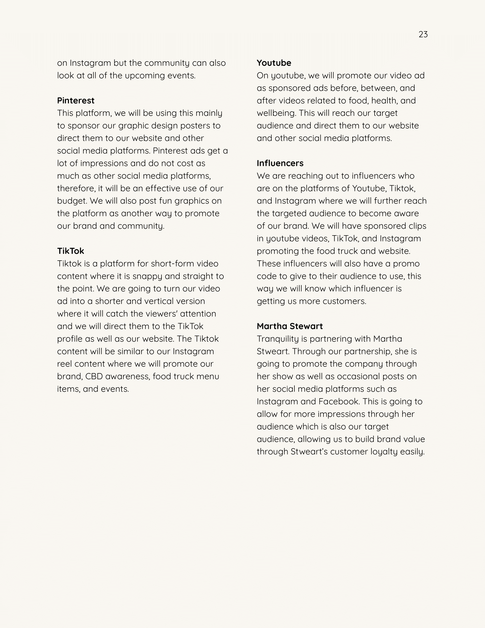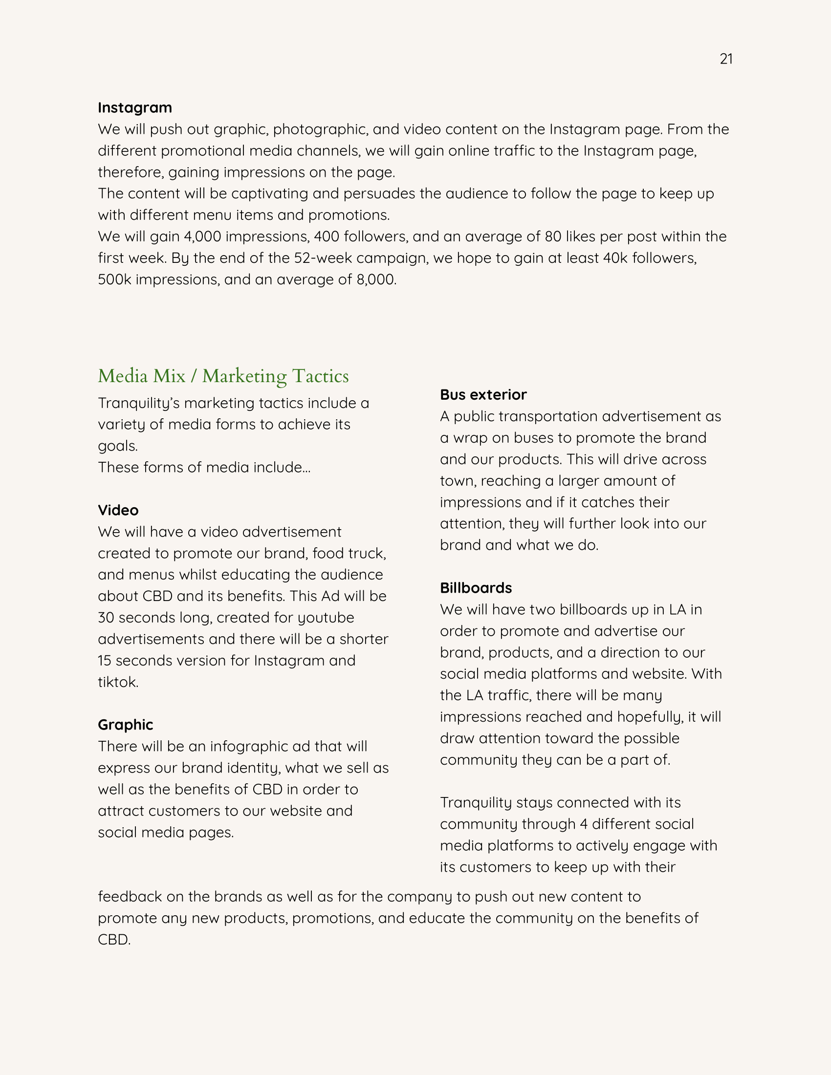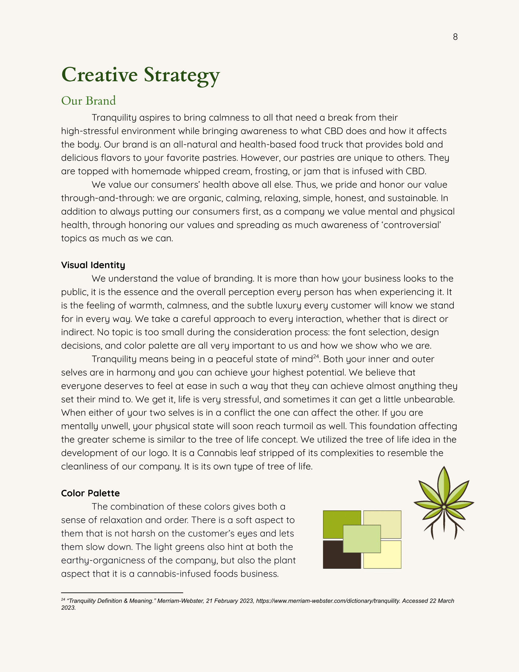 In response to an RFP from an investor interested in launching a food truck as the first step in a larger food-based enterprise, our team of four embarked on creating a compelling business proposal that included a detailed marketing plan, brand strategy, and launch campaign within a $50,000 budget. Introducing Tranquility, a healthy mobile eatery focused on promoting stress reduction through nutritious, thoughtfully crafted meals. Through Tranquility, we aimed to raise awareness about the positive mental health impact of CBD, a compound that is often stigmatized and wrongly compared to psychedelic THC.